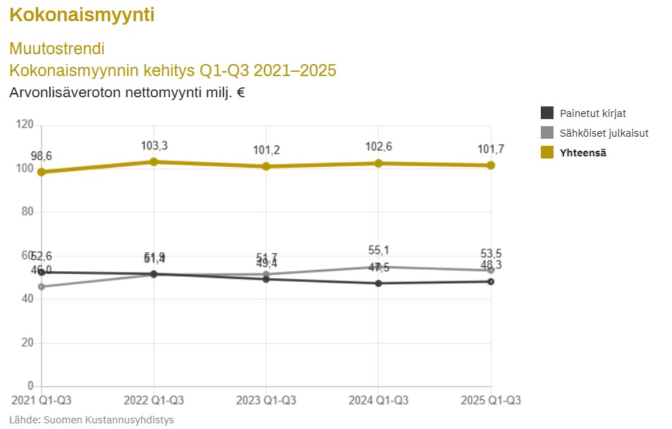 Vuoden kolmas kvartaalitilasto ennustaa painetulle kirjallisuudelle hieman parempaa ja sähköiselle hieman heikompaa myyntiä kuin edellisvuonna. Kokonaismyynti on vajaan prosentin jäljessä vuodesta 2024.